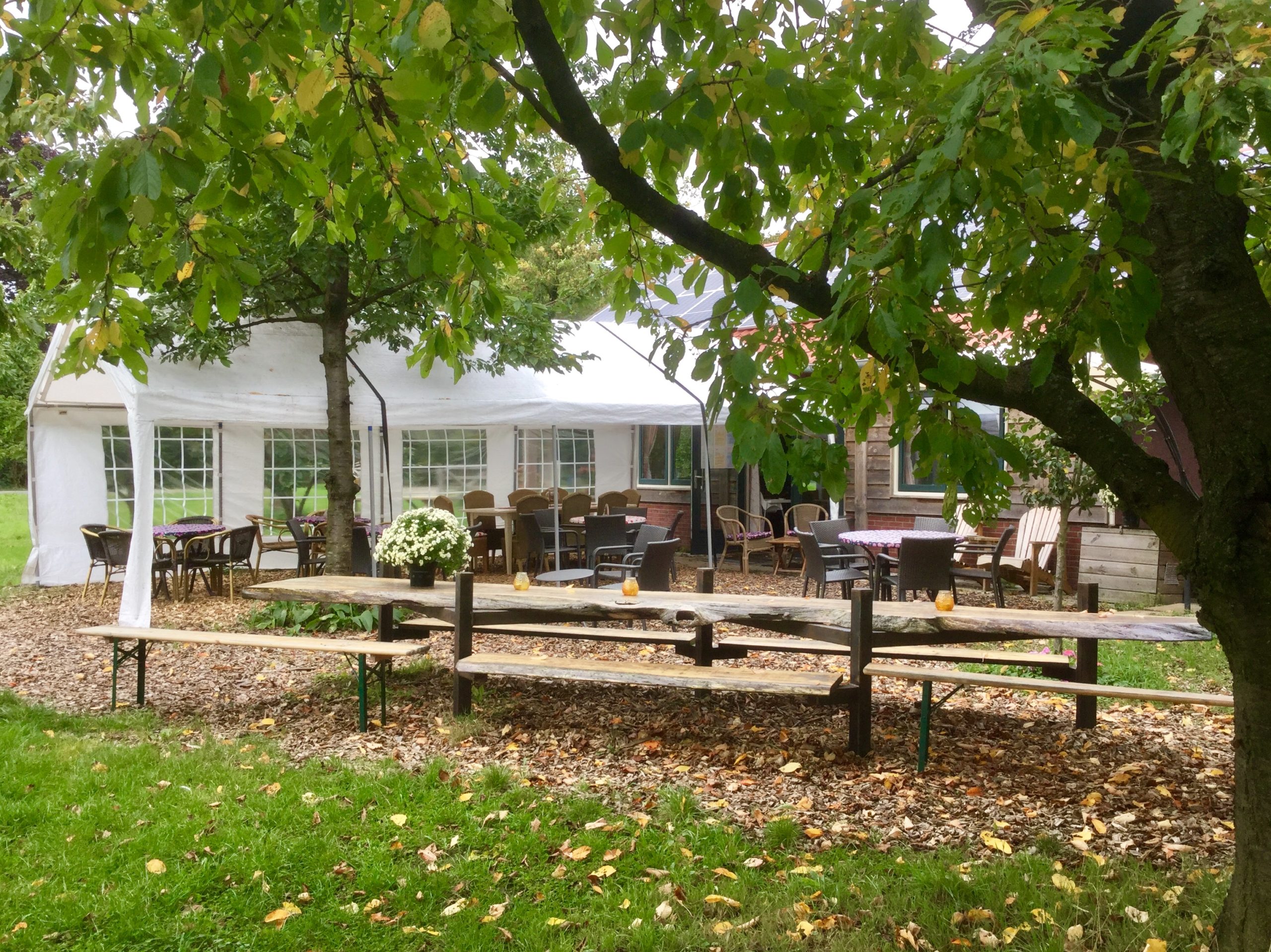 Mocht het dan onverwacht slecht weer zijn, dan zijn er 10 zitplaatsen binnen, 10 in de tent en 8 op de veranda; alles corona proof op 1,5 m.