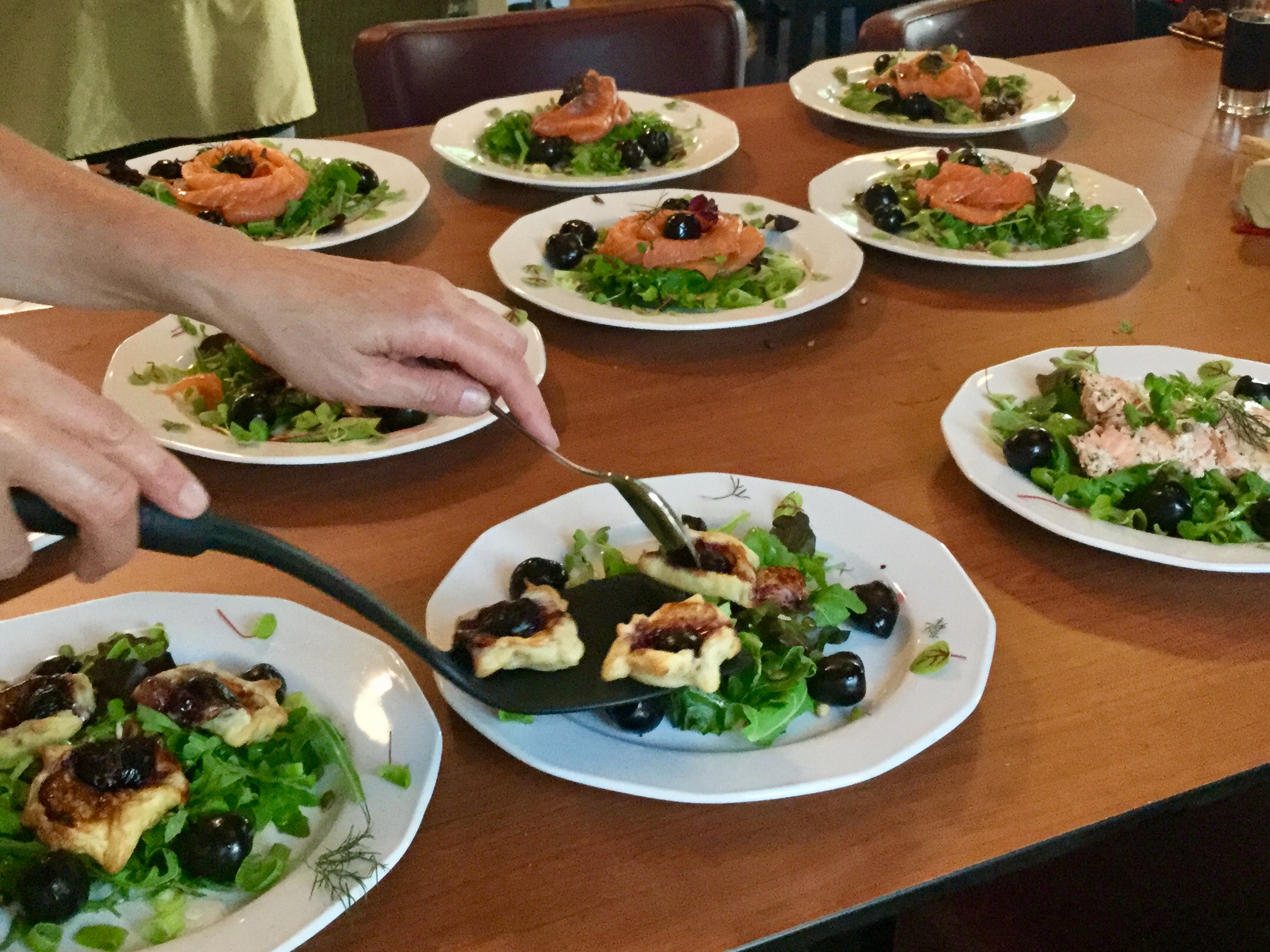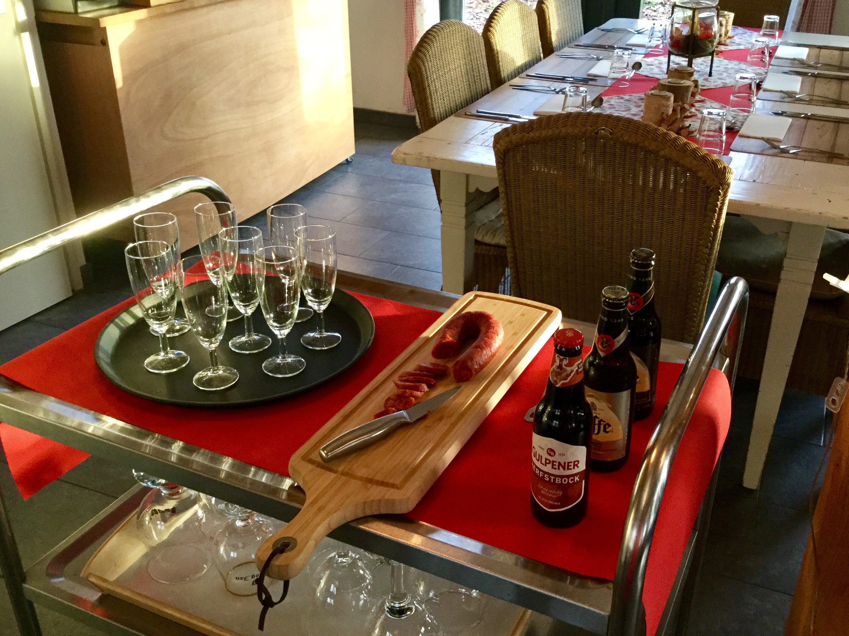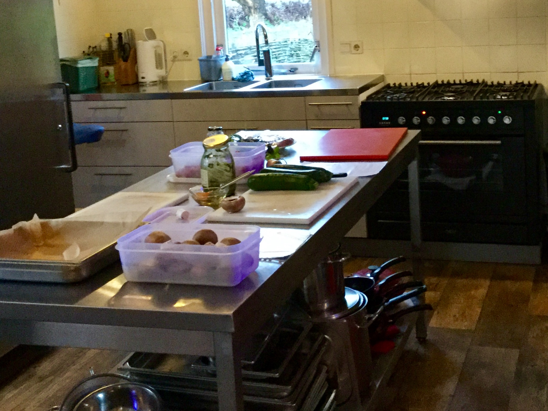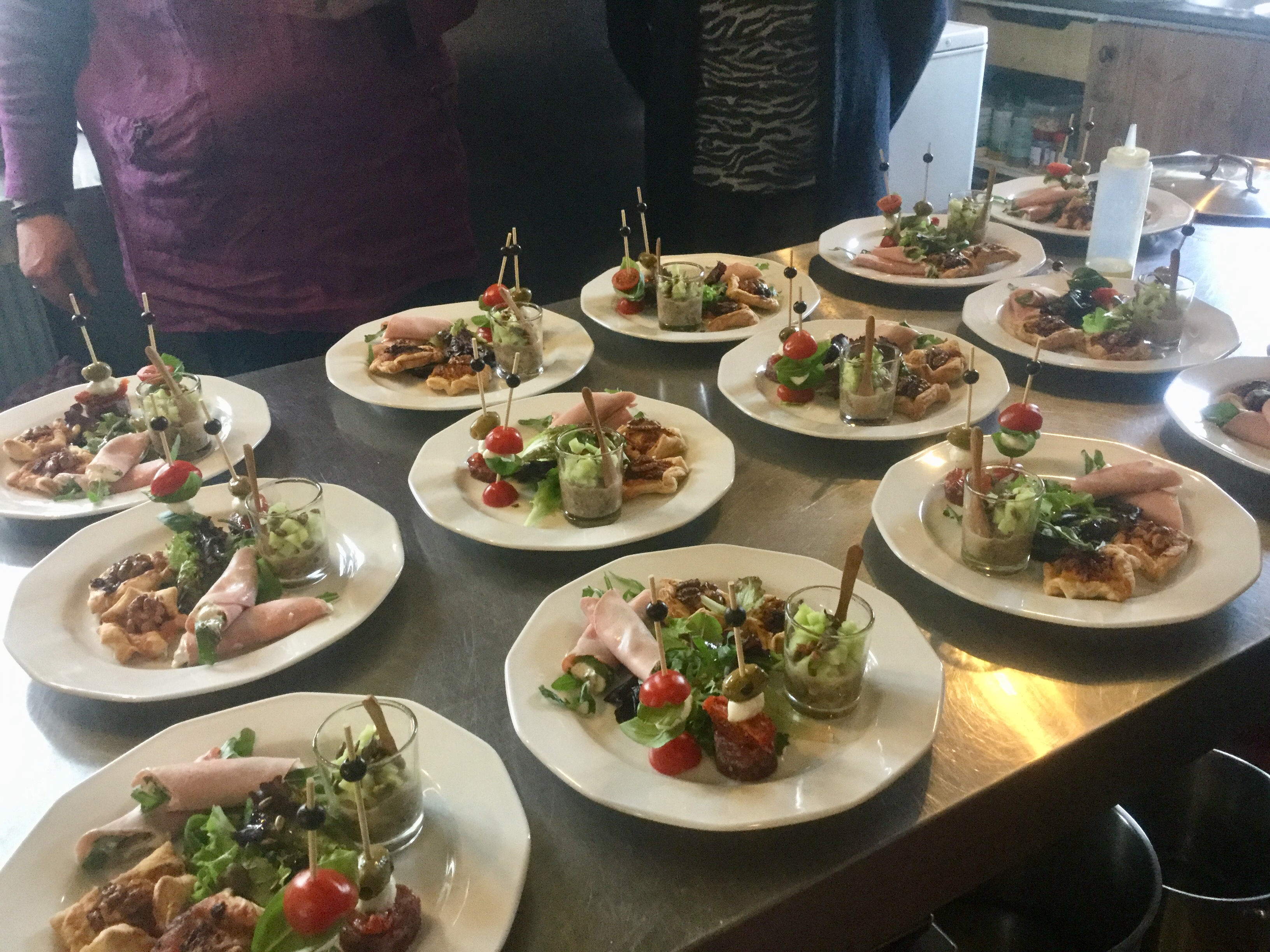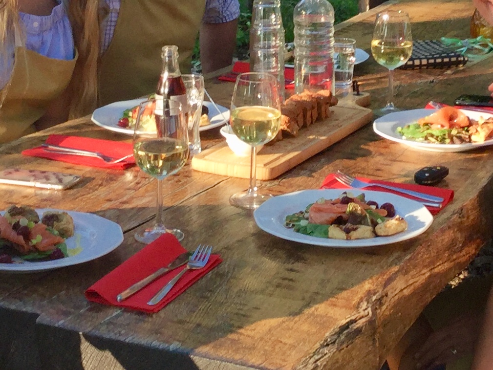 In een uurtje bereid u in groepjes alles voor. Daarna worden de borden voor het voorgerecht opgemaakt en gaat u aan tafel.