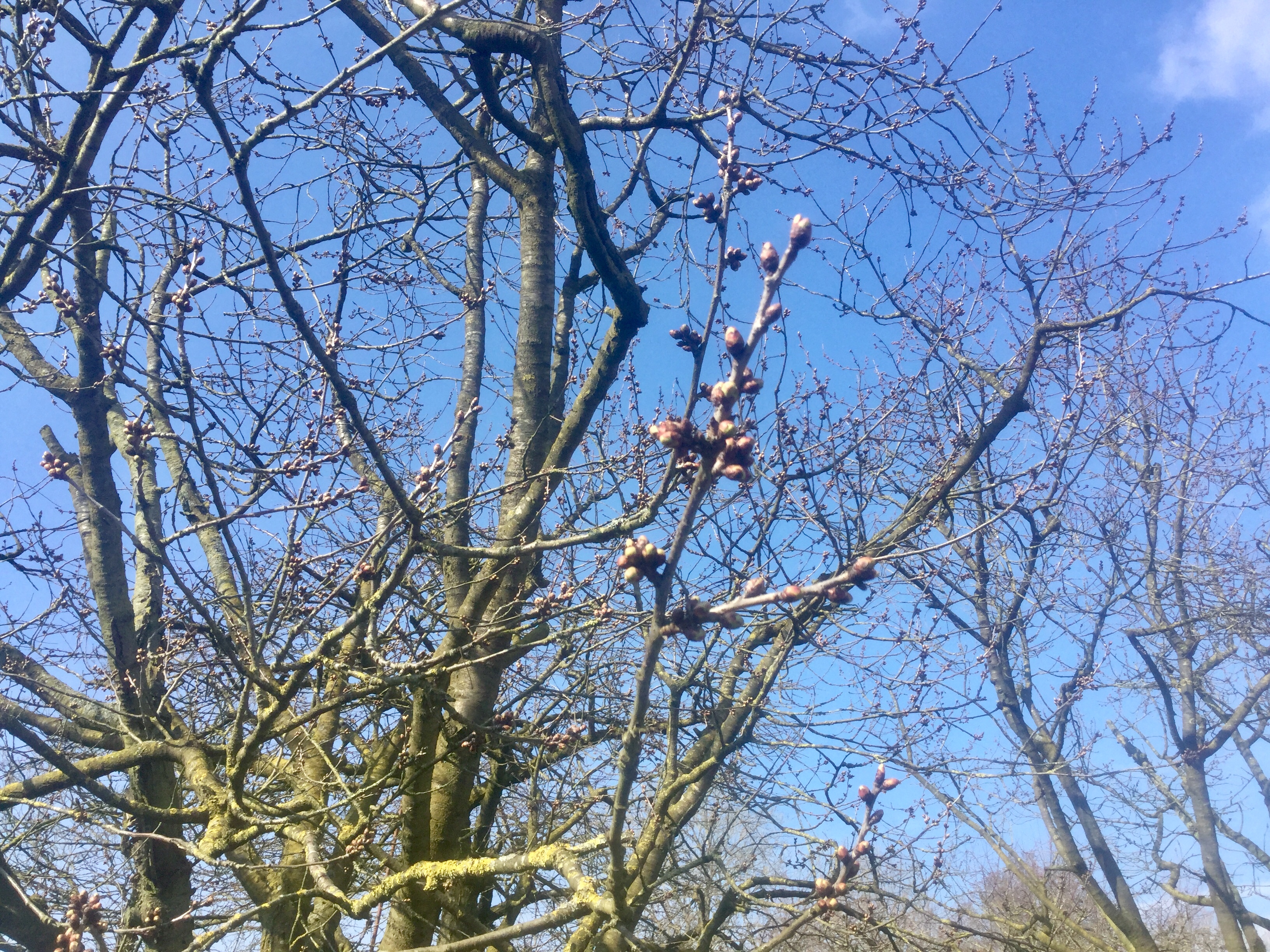 Als u goed kijkt, dan ziet u de eerste knoppen in de Maai-kers zitten. Het hangt van het weer af, wanneer de boomgaard in bloei staat. Naar verwachting zal ergens half/ eind april de boomgaard bloeien, afhankelijk van hoe warm het wordt en hoe lang dit aanhoudt!
