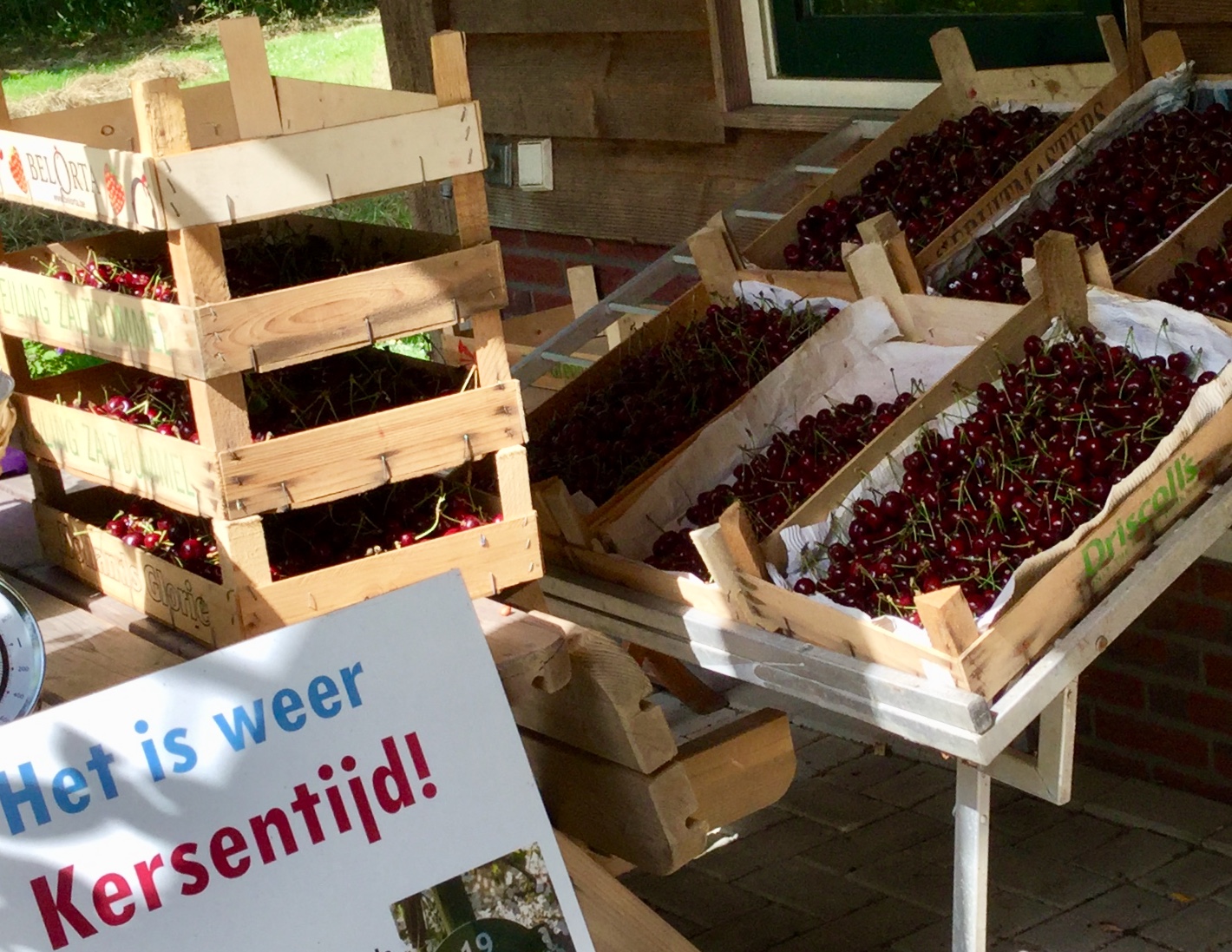 De kersen worden aan de kraam verkocht, verwerkt in gebak, lunch en diner, en we maken er sap, gelei en jam van.